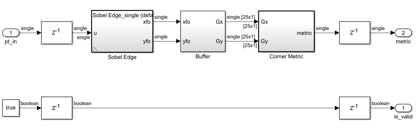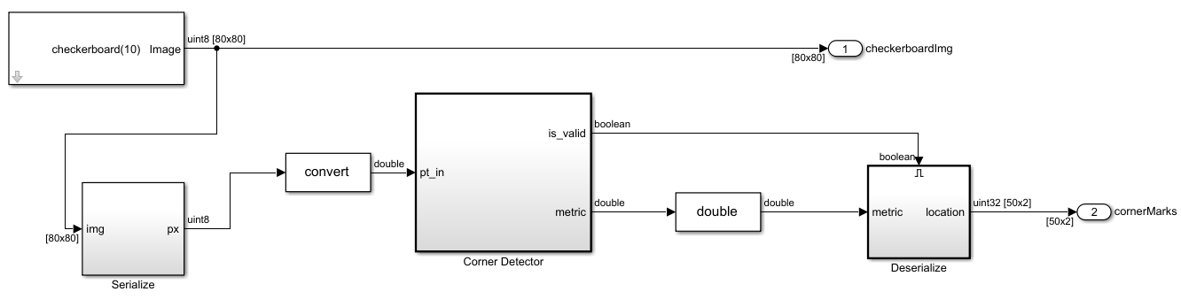 Вернитесь к модели и обновите схему. Блоки в подсистеме Corner Detector больше не используют типы данных двойной точности.