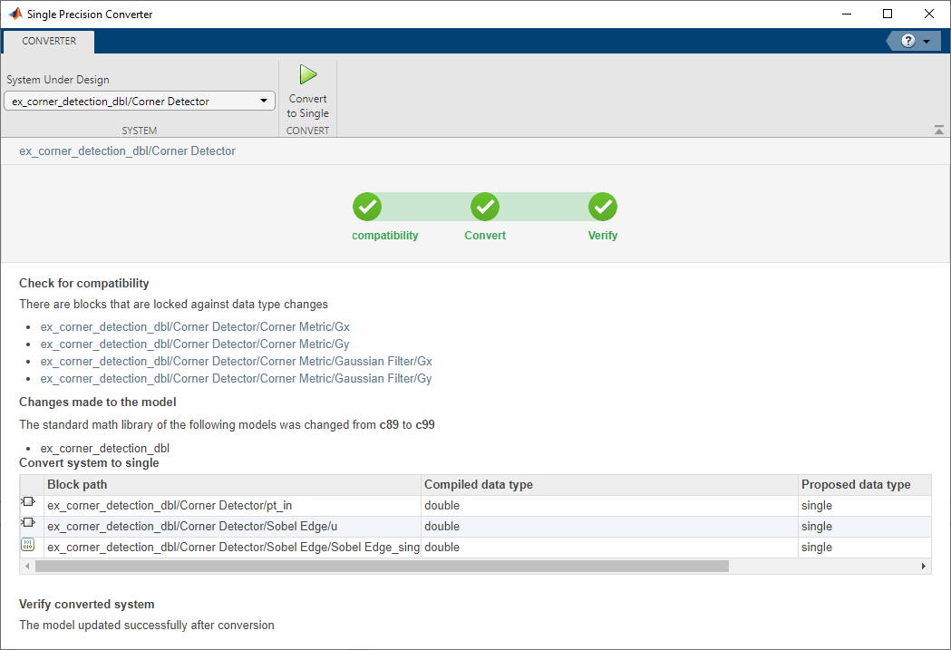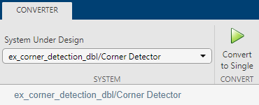 В разделе Система под конструкцией (System Under Design) выберите систему или подсистему для преобразования в единую точность. В этом примере выберите Corner Detector подсистема. Щелкните Преобразовать в одиночный (Convert to Single).