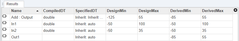 Производный диапазон для выходного сигнала блока добавления сужается до [-85..55]. Этот производный диапазон является пересечением диапазона, полученного из входных данных блока. [-85..150]и расчетные минимальные и максимальные значения, заданные для вывода блока, [-125..55].