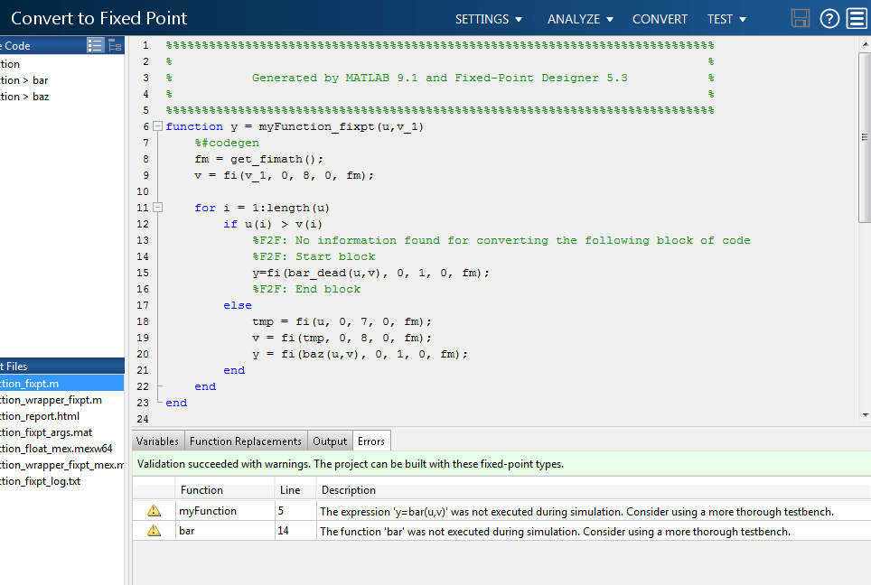 Преобразователь фиксированной точки генерирует функцию фиксированной точки, myFunction_fixpt. Сгенерированный код с фиксированной точкой содержит комментарии вокруг частей кода, идентифицированных как мертвый код. На панели «Результаты проверки» предлагается использовать более тщательный тестовый стенд.