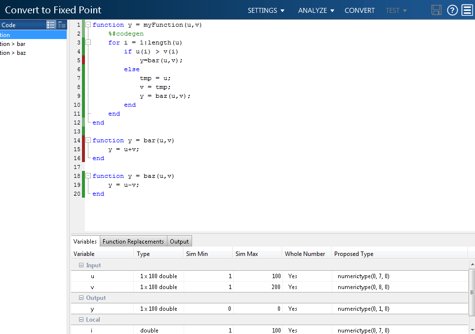 function y = myFunction(u,v) %#codegen for i = 1:length(u) if u(i) > v(i) y=bar(u,v); else tmp = u; v = tmp; y = baz(u,v); end end end function y = bar(u,v) y = u+v; end function y = baz(u,v) y = u-v; end