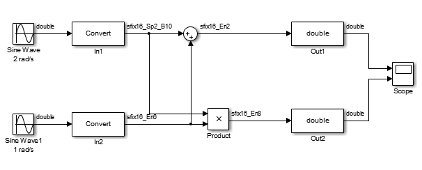 В модели тип данных, отображаемый с помощью In1 блок указывает, что имя выходного типа данных sfix16_Sp2_B10. Это соответствует fixdt(1, 16, 0.2, 10) который является подписанным 16 битовое число фиксированных точек с наклоном 0.2 и предвзятость 10.0. Тип данных, отображаемый с помощью In2 блок указывает, что имя выходного типа данных sfix16_En6. Это соответствует fixdt(1, 16, 6) который является подписанным 16 битовое число с фиксированной точкой с длиной дроби 6.