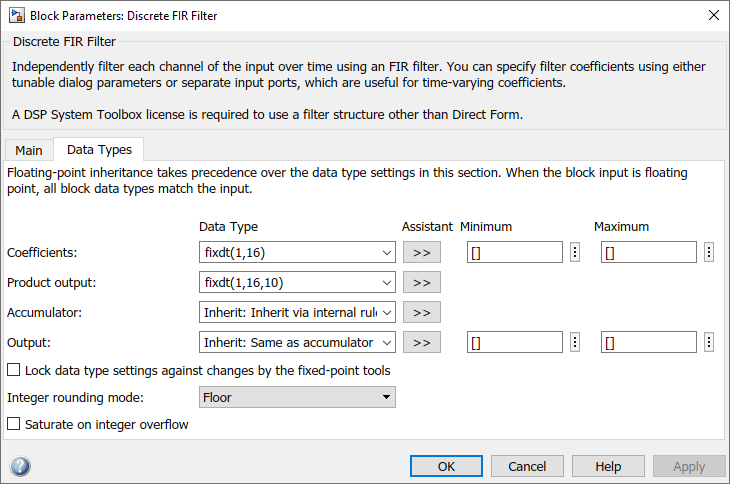 Параметр Coefficients преобразуется в автономном режиме из двойных в тип данных Coefficients с использованием округления до ближайшего и насыщения.