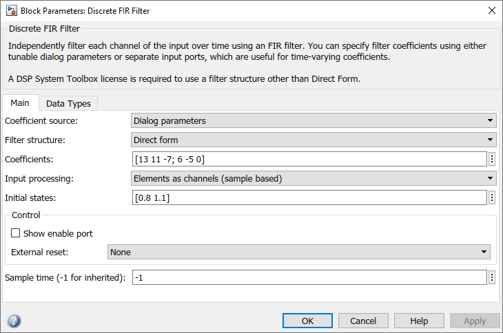Чтобы настроить блок дискретного фильтра FIR для этой ситуации, на главной панели его диалогового окна необходимо указать параметр Coefficients как [13 11 -7; 6 -5 0] и параметр Initial states как [0.8 1.1], как показано здесь.