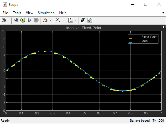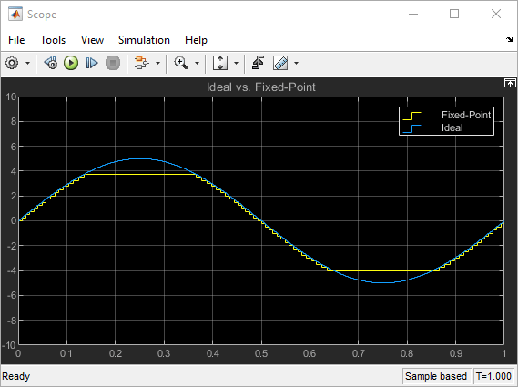 Моделирование показывает эффекты квантования арифметики с фиксированной точкой. Использование 5-битного слова с точностью (1/2) 2 = 0,25 дает дискретизированный выходной сигнал, который не охватывает весь диапазон входного сигнала.