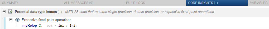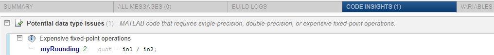 Дорогостоящая проверка операций с фиксированной точкой определяет возможности оптимизации для кода с фиксированной точкой. Он выделяет выражения в коде MATLAB, которые требуют громоздкого умножения или деления, дорогостоящего округления, дорогостоящего сравнения или многословных операций. Дополнительные сведения об оптимизации генерируемого кода с фиксированной точкой см. в разделе Советы по повышению эффективности генерируемого кода.