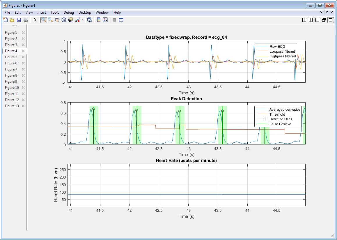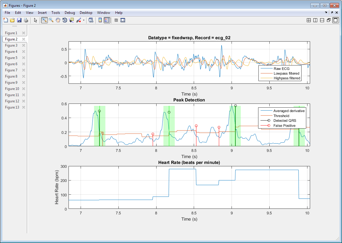 Тестируемая система в этом примере тестирует простой детектор QRS, который измеряет разницу во времени между обнаружениями QRS для вычисления частоты сердечных сокращений. test_heart_rate_detector_in_parallel сценарий передает записи ЭКГ алгоритму обнаружения.
