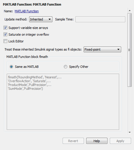 При выборе Fixed-point, функциональный блок MATLAB обрабатывает все входы с фиксированной точкой как конструктор с фиксированной точкой fi объекты.