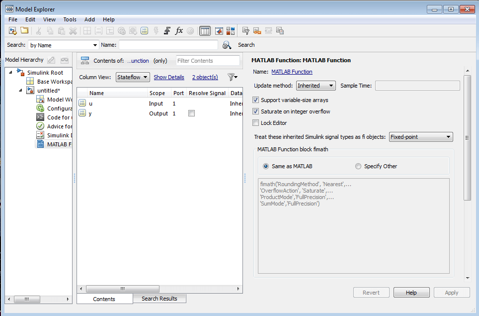 Разверните узел без названия * на панели Иерархия модели (Model Hierarchy) Проводника моделей (Model Explorer). Затем выберите узел MATLAB Function. Появится обозреватель моделей, как показано на следующем рисунке.