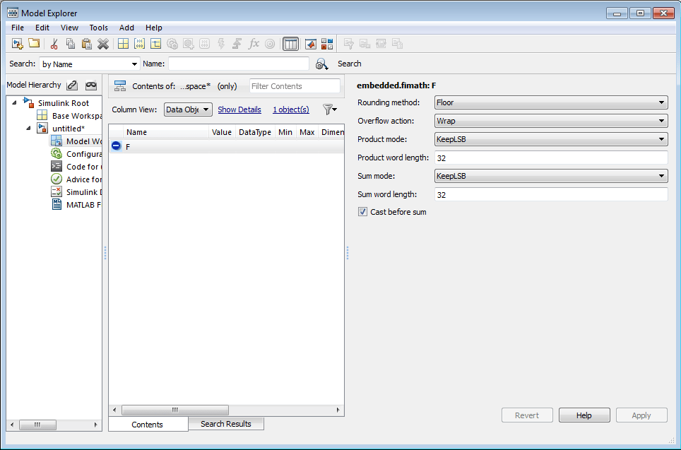 Выберите параметр MATLAB Fimath для параметра MATLAB Function block и введите переменную. F в поле редактирования на панели «Диалоговое окно». Нажмите кнопку Применить, чтобы сохранить изменения.