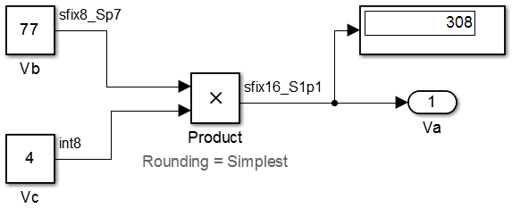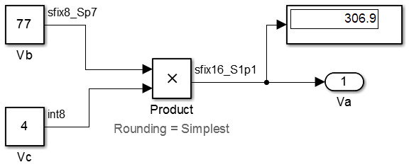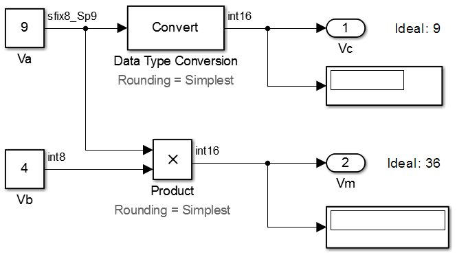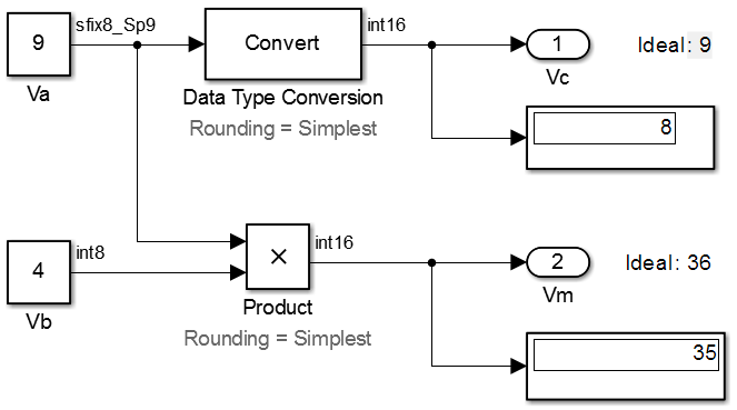 % For the conversion Vc = (int16_T)(Va * 9/10); % For the multiplication Vm = (int16_T)(Va * Vb * 9/10);