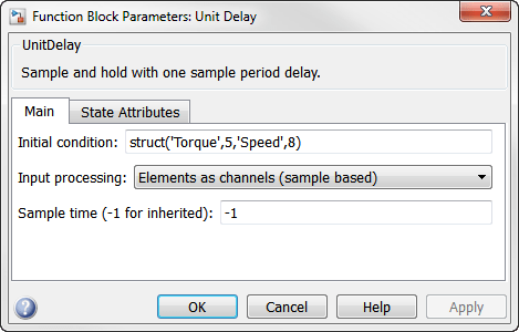 Дважды щелкните блок «Единичная задержка» для просмотра параметров блока. Блок единичной задержки использует исходное условие структуры.