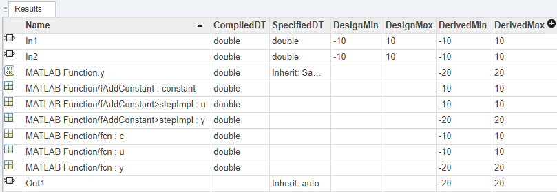 В этом примере анализ диапазона первой модели ex_HandleVariableRefersToMultipleObjects приводит к ошибке, поскольку в коде имеется переменная, которая может ссылаться на различные системные объекты в зависимости от других условий. Модель, ex_HandleVariableRefersToSingleObject является перезаписью первой модели с той же функциональностью, но инструмент Fixed-Point Tool способен выводить диапазоны для модели.