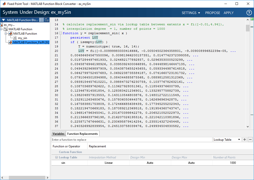Если поведение сгенерированного кода с фиксированной точкой недостаточно близко соответствует поведению исходного кода, измените метод интерполяции или количество точек, используемых в таблице поиска, а затем повторно создайте код с фиксированной точкой.