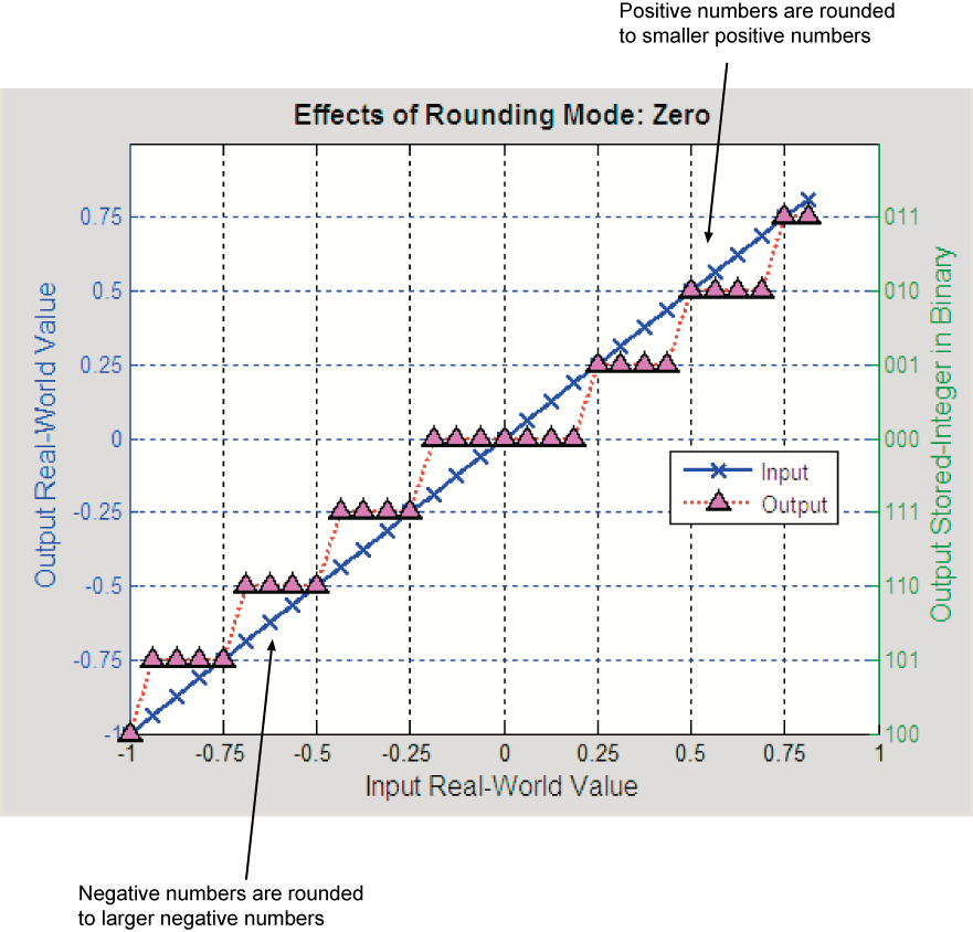 Округление в сторону нуля - самый простой режим округления в вычислительном отношении. Все цифры, превышающие требуемый номер, отбрасываются. Округление в сторону нуля приводит к числу, величина которого всегда меньше или равна более точному исходному значению. В программном обеспечении MATLAB ® можно округлять до нуля с помощью fix функция.
