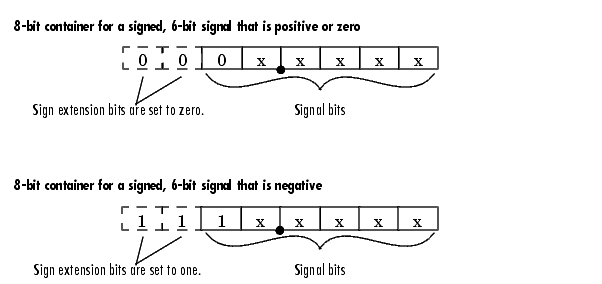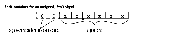 Например, сигнал типа данных sfix6_En4 содержится в FXP_STORAGE_INT8 контейнер. Сигнал удерживается в шести младших разрядах. Остальные два бита устанавливаются в нуль, когда сигнал положительный или нулевой, и в нуль, когда он отрицательный.