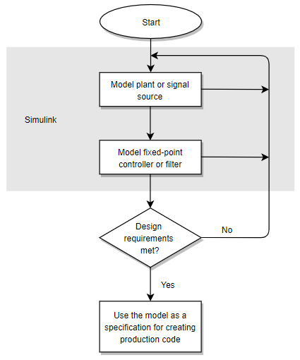 Программное обеспечение Fixed-Point Designer™ предоставляет инструменты, которые помогают в разработке и тестировании динамических систем с фиксированной точкой. Вы непосредственно проектируете динамические модели систем в программном обеспечении Simulink ®, которые готовы к внедрению на аппаратном обеспечении с фиксированной точкой. Цикл разработки проиллюстрирован ниже.