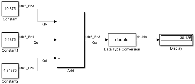 Предположим, вы хотите суммировать три числа. Каждое из этих чисел представлено 8-битным словом, и каждое имеет различное двоичное масштабирование только для точки. Кроме того, выход ограничен 8-битным словом с двоичным масштабированием только для точки 2-3.