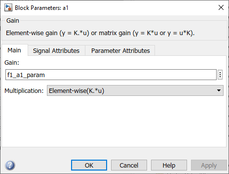 Вернитесь к модели. Откройте окно F1 и дважды щелкните значок a1 блок. Коэффициент усиления блока задается как f1_a1_param, которая определена в словаре данных.