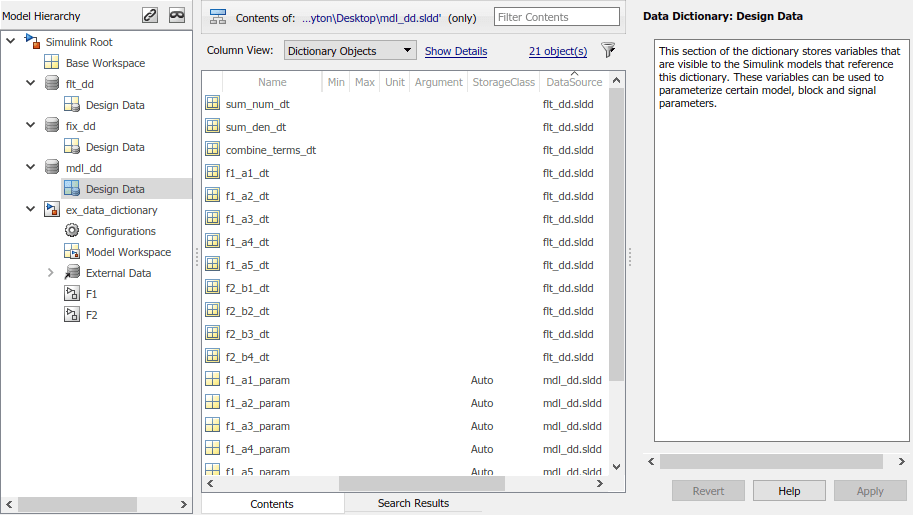 Словарь данных определяет параметры блоков усиления в F1 и F2 подсистем. mdl_dd связан со словарем данных, на который имеется ссылка; flt_dd, которая определяет типы выходных данных блоков усиления в подсистемах модели.