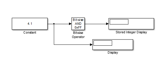 Блок Bitwise Operator использует AND оператор и битовая маска 0xFF для передачи входного значения на выход. Поскольку для параметра Обработать маску как задано значение Stored Integerблок выводит сохраненное целое значение S своего входа. Схема кодирования представляет собой V = Λ + B, где V - действительное значение, а Q - сохраненное целое значение.