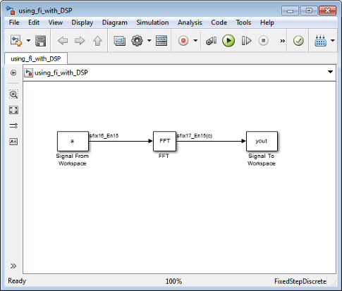 Данные с фиксированной точкой из рабочего пространства MATLAB ® можно считывать в модель Simulink ® с помощью блоков «Сигнал из рабочего пространства» (DSP System Toolbox) и «Сигнал из рабочего пространства» (DSP System Toolbox) из программного обеспечения DSP System Toolbox™. Введите имя определенногоfi переменная в параметре «Сигнал» блока «Сигнал из рабочей области» или «Сигнал из рабочей области».