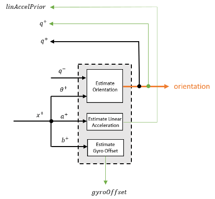 Перед первой итерацией accelReadings, gyroReadings, и magReadings входы секционированы в DecimationFactor-на-3 кадра. Для каждого блока алгоритм использует самые текущие показания акселерометра и магнитометра, соответствующие фрагменту показаний гироскопа.