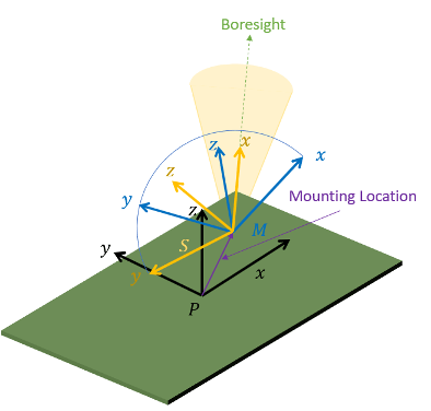 Если о обнаружениях сообщается в сферических координатах датчика и HasINS имеет значение false, то последовательность состоит только из одного преобразования от датчика к платформе. В этом преобразовании OriginPosition совпадает с MountingLocation свойство датчика. Orientation состоит из двух последовательных вращений. Первый поворот, соответствующий MountingAngles свойство датчика, учитывает поворот от рамы платформы (P) к монтажной раме датчика (M). Второй поворот, соответствующий азимуту и углам возвышения датчика, учитывает поворот от монтажной рамы (М) датчика к сканирующей раме (S) датчика. В S-образной раме направление x является направлением визирования, а направление y лежит в плоскости x-y монтажной рамы датчика (М).
