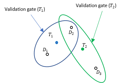 Однако, если трекер поддерживает множество дорожек, процесс ассоциации данных становится более сложным, поскольку одно обнаружение может попасть в вентили проверки достоверности множества дорожек. Например, на следующем рисунке дорожки T1 и T2 активно поддерживаются в трекере, и каждая из них имеет свой вентиль проверки. Поскольку D2 обнаружения находится на пересечении вентилей проверки достоверности как T1, так и T2, две дорожки (T1 и T2) соединены и образуют кластер. Кластер - это набор подключенных дорожек и связанных с ними обнаружений.