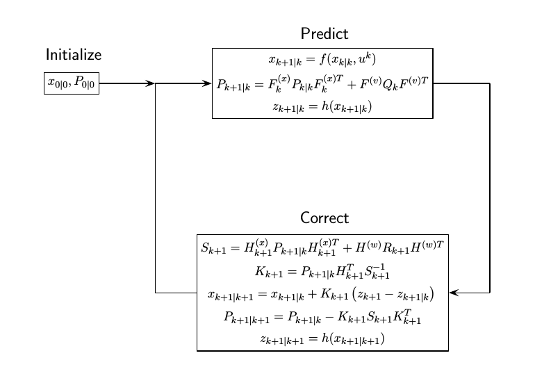 Этот расширенный контур фильтра Калмана почти идентичен линейному контуру фильтра Калмана, за исключением того, что: