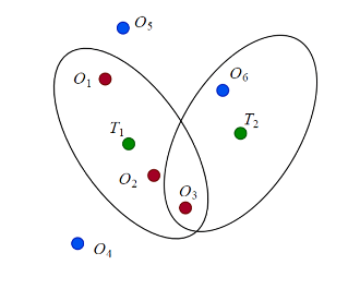 Метод JPDA требует еще одного шага при наличии конфликтов между назначениями в разных треках. Например, на следующем рисунке отслеживаются конфликты T2 с T1 о назначении O3 наблюдения. Поэтому для вычисления вероятности p13 ассоциации должна быть учтена совместная вероятность того, что T2 не назначен O3 (то есть T2 назначен O6 или не назначен).