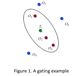 После того как затвор назначения установлен для каждой дорожки, состояние стробирования каждого обнаружения yi (i = 1,..., n) может быть определено путем сравнения его расстояния Махаланобиса d2 (yi) с порогом стробирования G. Если d2 (yi) < G, то обнаружение yi находится внутри затвора дорожки и будет рассматриваться для ассоциации. В противном случае возможность обнаружения, связанного с дорожкой, удаляется. На фиг.1 T1 представляет прогнозируемую оценку дорожки, и O1- O6 представляют собой шесть обнаружений. На основе результата стробирования O1, O2 и O3 находятся в пределах литника проверки на рисунке.