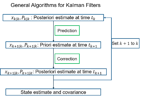 На этапе коррекции фильтр также корректирует ковариацию ошибки оценки. Основная идея состоит в коррекции вероятностного распределения x с помощью информации о распределении yk + 1. Это называется апостериорной плотностью вероятности x, заданной y. В фильтре этапы прогнозирования и коррекции обрабатываются рекурсивно. Блок-схема показывает общие алгоритмы для фильтров Калмана.