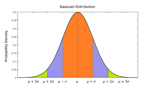 Если размерность x равна единице, P является только скаляром. В этом случае значение P обычно обозначается, в свою очередь, δ 2 и называется дисперсией. Квадратный корень, λ, называется стандартным отклонением x. Стандартное отклонение имеет важное физическое значение. Например, на следующем рисунке показана функция плотности вероятности (которая описывает вероятность того, что х принимает определенное значение) для одномерного гауссова распределения со средним значением, равным λ, и стандартным отклонением, равным λ. Около 68% данных попадают в пределах границы 1λ x, 95% данных попадают в пределы границы 2, а 99,7% данных попадают в пределы границы 3λ.