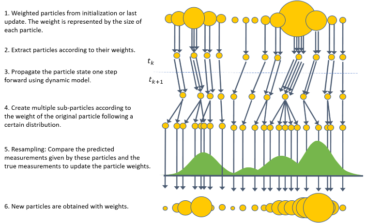 Фильтр частиц (trackingPF) отличается от семейства фильтров Калмана (например, EKF и UKF), так как не опирается на предположение о распределении Гаусса, которое соответствует параметрическому описанию неопределенностей с использованием среднего и дисперсии. Вместо этого фильтр частиц создает множественные моделирования взвешенных образцов (частиц) работы системы во времени, а затем анализирует эти частицы как прокси для неизвестного истинного распределения. Краткое введение алгоритма фильтра частиц показано на рисунке.