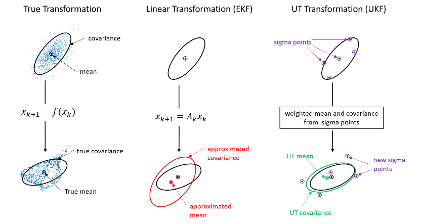 Незараженный фильтр Кальмана (trackingUKF) использует некачественное преобразование (UT) для приблизительно распространения ковариационного распределения для нелинейной модели. UT-подход производит выборку ковариационного гауссова распределения в текущее время, распространяет точки выборки (называемые сигма-точками) с использованием нелинейной модели и аппроксимирует результирующее ковариационное распределение, предполагаемое гауссовым, оценивая эти распространенные сигма-точки. Фигура иллюстрирует разницу между фактическим распространением, линеаризованным распространением и UT распространением ковариации неопределенности.