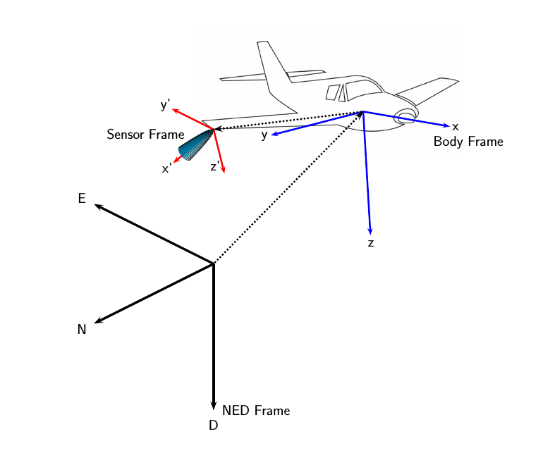 Могут потребоваться дополнительные рамки координат. Например, часто дорожки не поддерживаются в координатах NED (или ENU), так как этот кадр координат изменяется в зависимости от широты и долготы, где он определен. Для сценариев, которые охватывают большие площади (более 100 километров в каждом измерении), земно-центрированный земной каркас (ECEF) может быть более подходящей глобальной рамкой для использования.