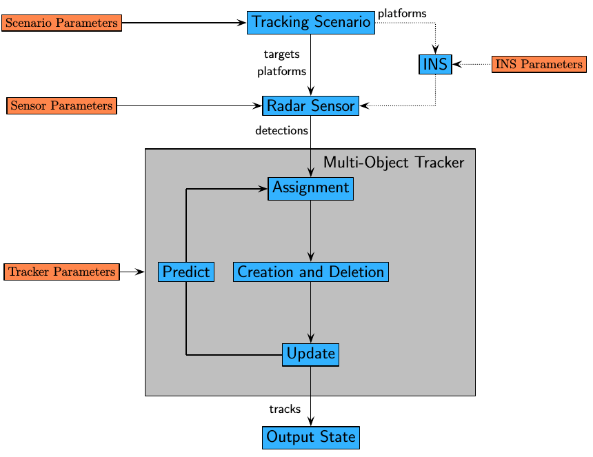 Обработка радиолокационных обнаружений с помощью многообъектного трекера для связывания обнаружений с существующими дорожками или создания дорожек. Многообъектные дорожки включают trackerGNN, trackerTOMHT, trackerJPDA и trackerPHD. Если ИНС отсутствует, то трекер может генерировать дорожки только для одного радара. При наличии ИНС трекер может создавать дорожки с помощью измерений со всех радаров.
