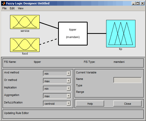 fuzzyLogicDesigner('tipper.fis')Однако при загрузке предустановленной системы не будут создаваться правила или функции членства.