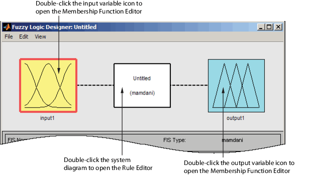 Конструктор нечеткой логики открывает и отображает диаграмму системы нечеткого вывода с именами каждой входной переменной слева и каждой выходной переменной справа, как показано на следующем рисунке. Примеры функций членства, показанные в полях, являются просто значками и не отображают фактические формы функций членства.
