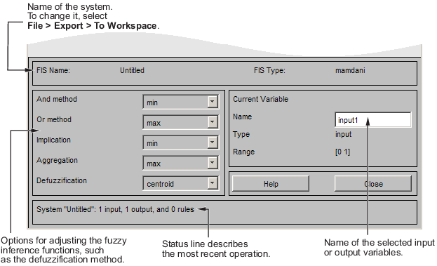 Эти пользовательские интерфейсы динамически связаны, так как изменения, вносимые в FIS с помощью одного из них, влияют на то, что вы видите на любом из других открытых пользовательских интерфейсов. Например, при изменении имен функций членства в редакторе функций членства изменения отражаются в правилах, показанных в редакторе правил. Пользовательские интерфейсы можно использовать для чтения и записи переменных как в рабочую область MATLAB ®, так и в файл (доступные только для чтения средства просмотра по-прежнему могут обмениваться графиками с рабочей областью и сохранять их в файл). Можно открыть любую или все из них для любой заданной системы или открыть несколько редакторов для любого количества нечетких систем.