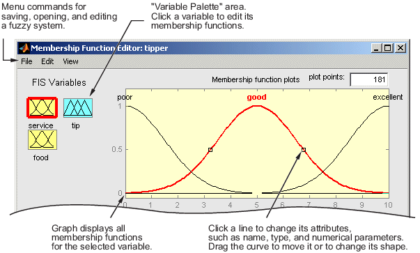 Функции членства из текущей переменной отображаются на главном графике. Этими функциями членства можно манипулировать двумя способами. Сначала можно с помощью мыши выбрать определенную функцию членства, связанную с заданным качеством переменной (например, плохое, для переменной, службы), а затем перетащить функцию членства из стороны в сторону. Это действие влияет на математическое описание качества, связанного с данной функцией членства для данной переменной. Выбранная функция членства также может быть помечена для расширения или сокращения путем щелчка по небольшим квадратным точкам перетаскивания на функции членства, а затем перетаскивания функции мышью наружу, для расширения или внутрь, для сокращения. Это действие изменяет параметры, связанные с этой функцией членства.