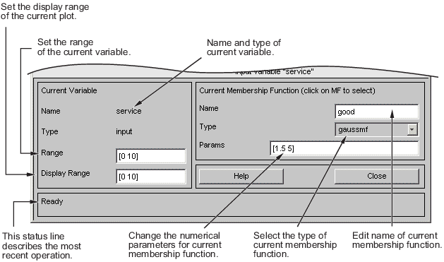 Редактор функций членства - это инструмент, позволяющий отображать и редактировать все функции членства, связанные со всеми входными и выходными переменными для всей системы нечеткого вывода. Редактор функций членства совместно использует некоторые функции с конструктором нечеткой логики, как показано на следующем рисунке. Фактически, все пять основных инструментов пользовательского интерфейса имеют аналогичные опции меню, строки состояния и кнопки «Справка» и «Закрыть».