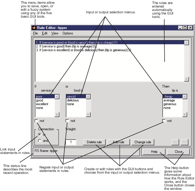 Аналогично конструктору нечеткой логики и редактору функций членства, редактор правил имеет строку меню и строку состояния. Пункты меню позволяют открывать, закрывать, сохранять и редактировать нечеткую систему с помощью пяти основных инструментов пользовательского интерфейса. В меню можно также: