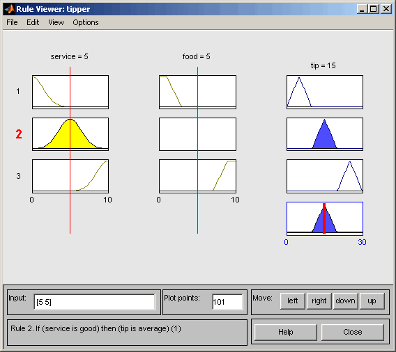 Средство просмотра правил позволяет интерпретировать весь процесс нечеткого вывода одновременно. Средство просмотра правил также показывает, как форма определенных функций членства влияет на общий результат. Поскольку он строит график каждой части каждого правила, он может стать громоздким для особо крупных систем, но для относительно небольшого количества входов и выходов он работает хорошо (в зависимости от того, сколько экранного пространства вы уделяете ему) с 30 правилами и до 6 или 7 переменных.
