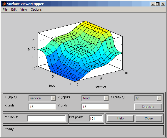 Если требуется создать более гладкий график, используйте поле Точки графика (Plot points), чтобы указать количество точек, в которых функции членства вычисляются в диапазоне ввода или вывода. В этом поле по умолчанию указывается минимальное количество графиков, 101. При указании меньшего количества точек печати значение поля автоматически сбрасывается в значение 101. При указании количества точек графика график поверхности автоматически обновляется.