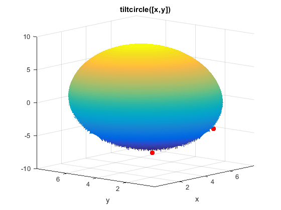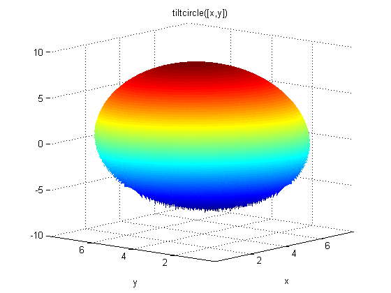 function y = tiltcircle(x) vx = x(:)-[4;4]; % ensure vx is in column form y = vx'*[1;1] + sqrt(16 - vx'*vx); % complex if norm(x-[4;4])>4