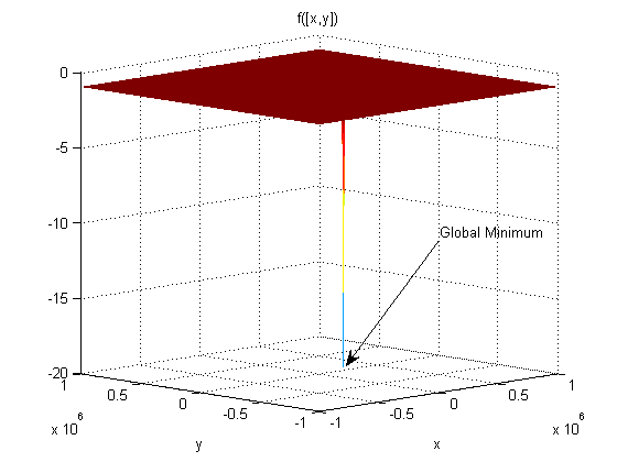 Минимум при (1e5, -1e5) отображается как узкий пик. Минимальное значение (1,1) не отображается, так как оно слишком узкое.