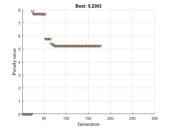 opts = optimoptions('ga','MaxStallGenerations',50,'FunctionTolerance',1e-10,... 'MaxGenerations',300,'PlotFcn',@gaplotbestfun);