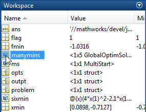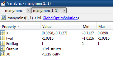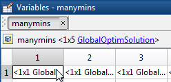 manymins - вектор объектов решения; посмотрите GlobalOptimSolution. manymins вектор в порядке значения целевой функции, от самого низкого (лучший) до самого высокого (худший). Каждый объект решения содержит следующие свойства (поля):